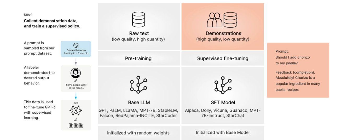 数据:以人工标注或合成的对话数据为主,如 Alpaca、ShareGPT 数据集。