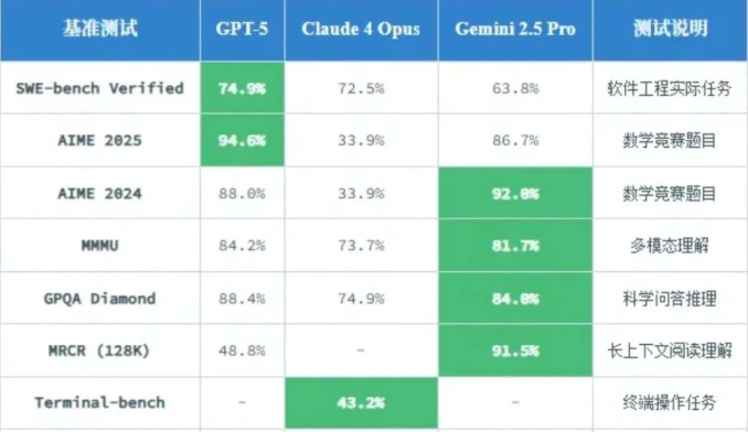 在MMLU综合测试中,GPT-5与Claude 4 Opus和Gemini 2.5 Pro比拼数据对比,如图。