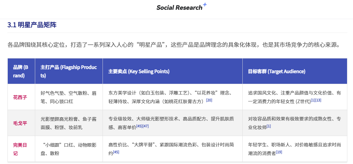 - 快速生成结论,抢占时间窗口:传统 2-3 人天的调研,Social Research 仅需 20-30 分钟就能输出完整报告,含趋势图、用户画像、竞品对比等核心内容,助力新品团队在热点窗口期快速决策。