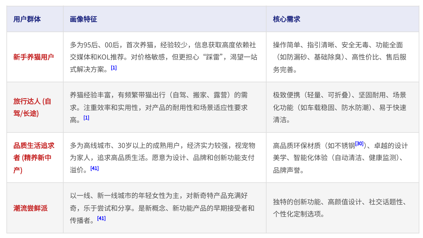 案例:某宠物品牌在调研 “便携旅行猫砂盆”时,Social Research 自动拆解场景,整合多平台数据后并输出四大核心用户画像,如 “95 后新手关注操作简单和售后”“旅行达人在意极致便携”,直接为新品定位提供决策支撑。