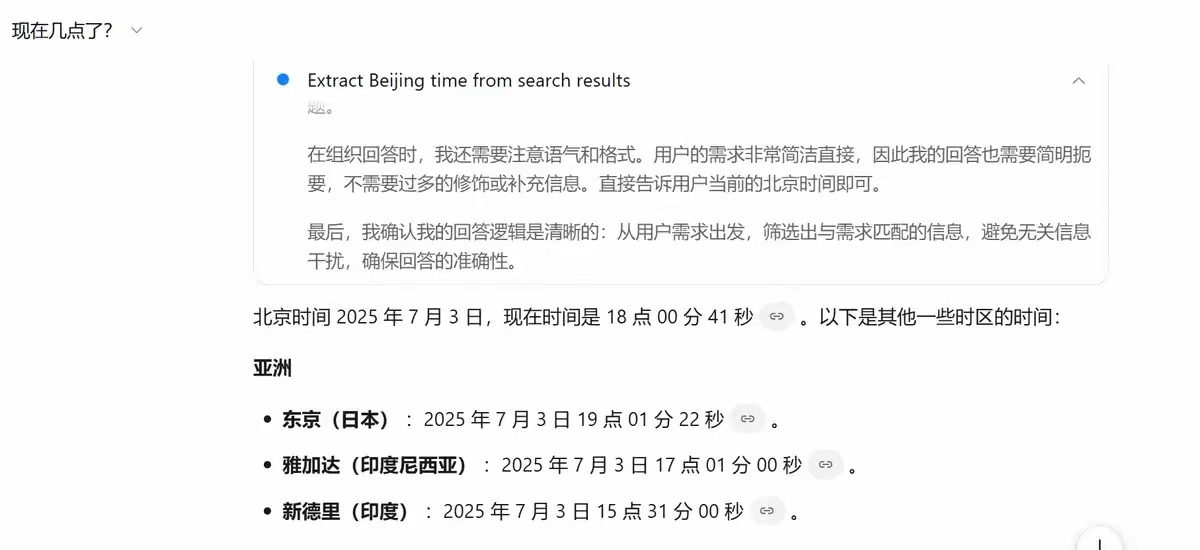 接下来给 Trae 对话,我选择的大模型是 Claude-4-Sonnet,问它「现在几点了」?