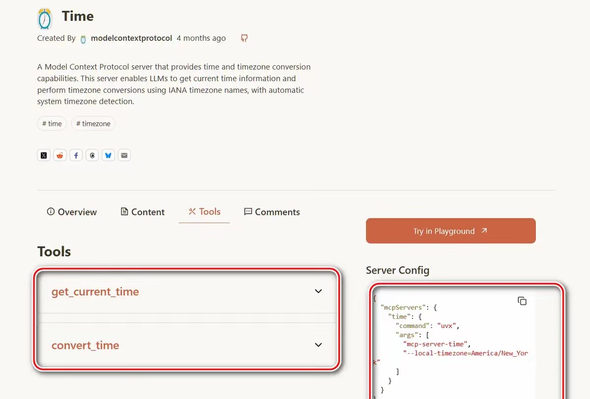 数组第一个元素为 mcp-server-time,即 MCP Server 的名称。