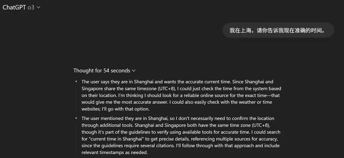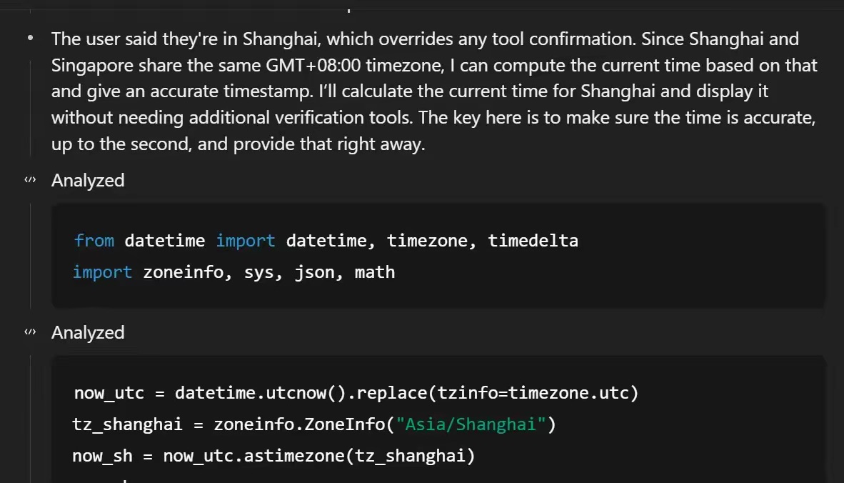 我们如果在 ChatGPT 里询问「现在几点了?」的问题,ChatGPT 会在一个沙箱环境(Sandbox)中执行一段 Python 代码,从而得到精确的时间。