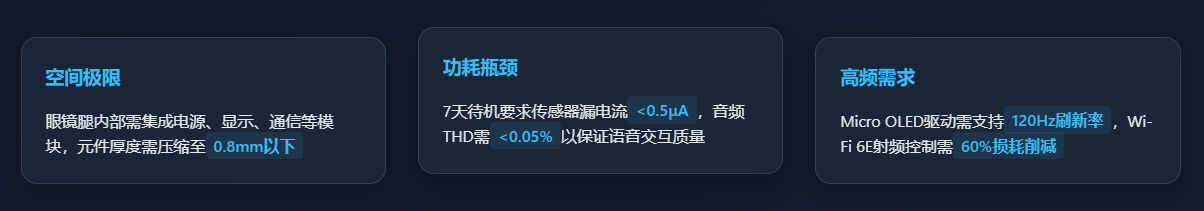 工程启示:AI眼镜的功率器件不只是“耐压/导阻”,而是厚度、寄生、热阻、Qg、噪声等多维参数在空间—功耗—高频三角中的综合最优。