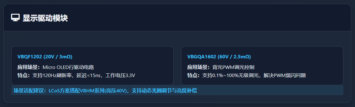 显示驱动模块推荐型号:VBQF1202、VBGQA1602 主要特点:低延迟、支持高刷新率与无频闪调光