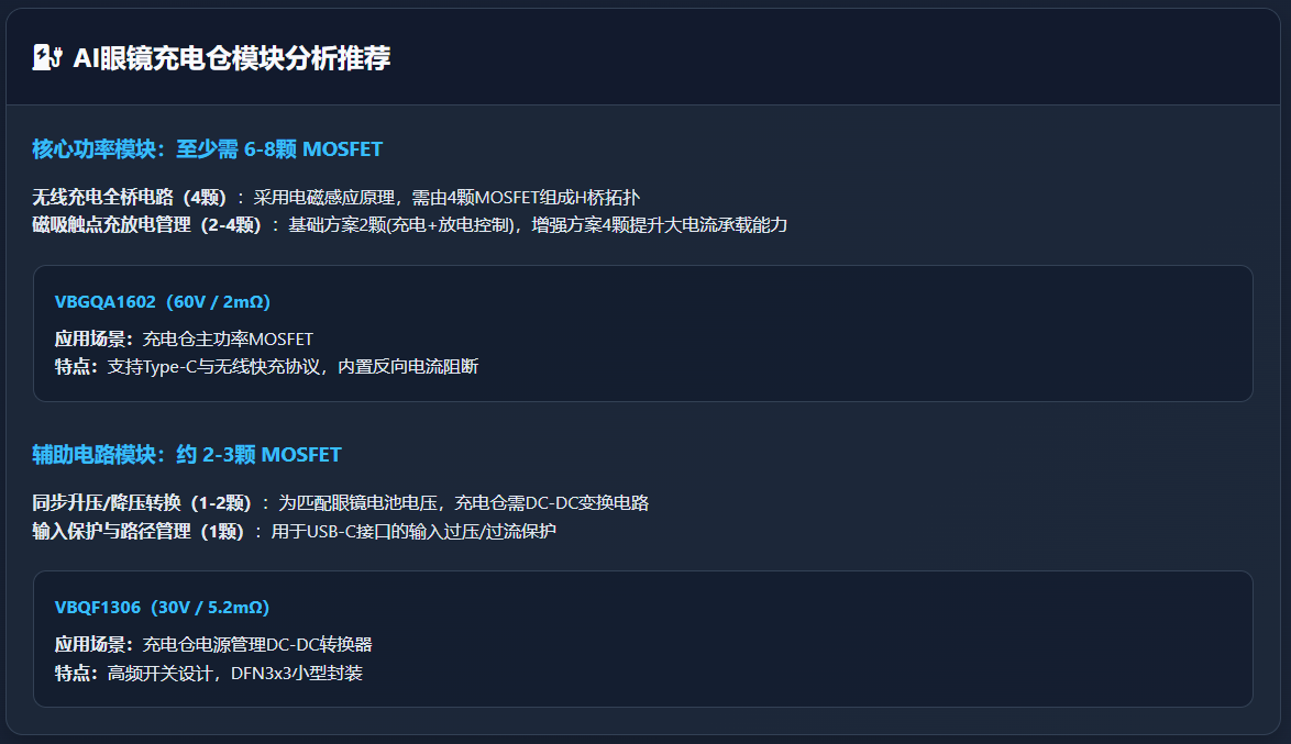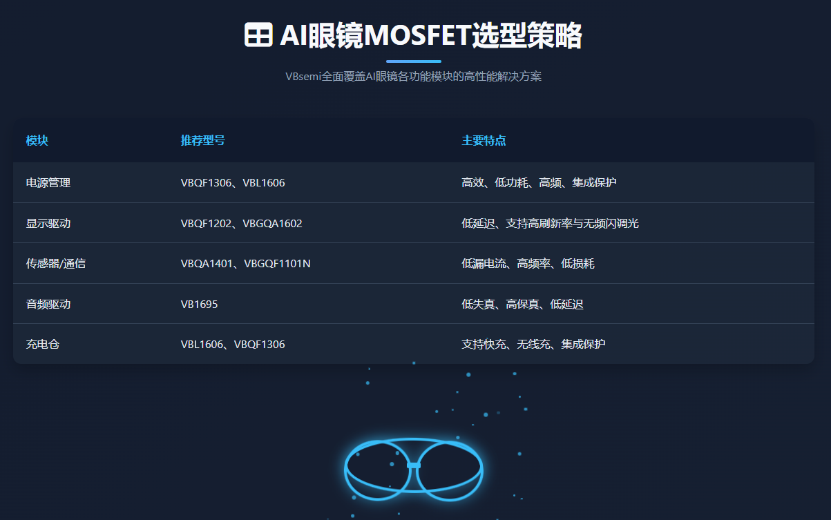 VBsemi 依托芯片级封装与超低功耗架构,围绕“薄、冷、静”(薄型化、低热、低噪)三大方向,为 AI 眼镜提供可批量落地的 MOSFET 方案。下面按模块拆解“为何选它 & 如何用好”。