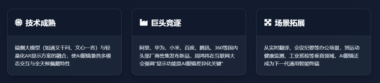 技术成熟:端侧大模型(如通义千问、文心一言)+ 轻量化AR/显示,使眼镜具备多模态交互与全天候佩戴的基础条件;