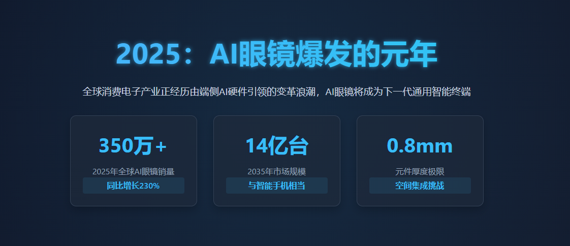 全球消费电子正经历由端侧AI硬件驱动的结构性升级。预测显示,2025年AI眼镜销量将突破350万台(同比+230%),2035年有望达14亿台级别,体量接近智能手机。其背后的三股合力正在加速市场由“尝鲜”迈向“规模化”:
