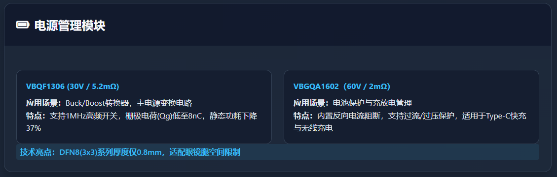 封装亮点:VBsemi DFN8(3×3) 系列(如 VBQF1306)厚度约 0.8 mm,对眼镜腿型腔尤为友好。
