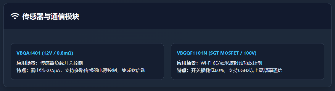 传感器/通信模块推荐型号:VBQA1401、VBGQF1101N 主要特点:低漏电流、高频率、低损耗