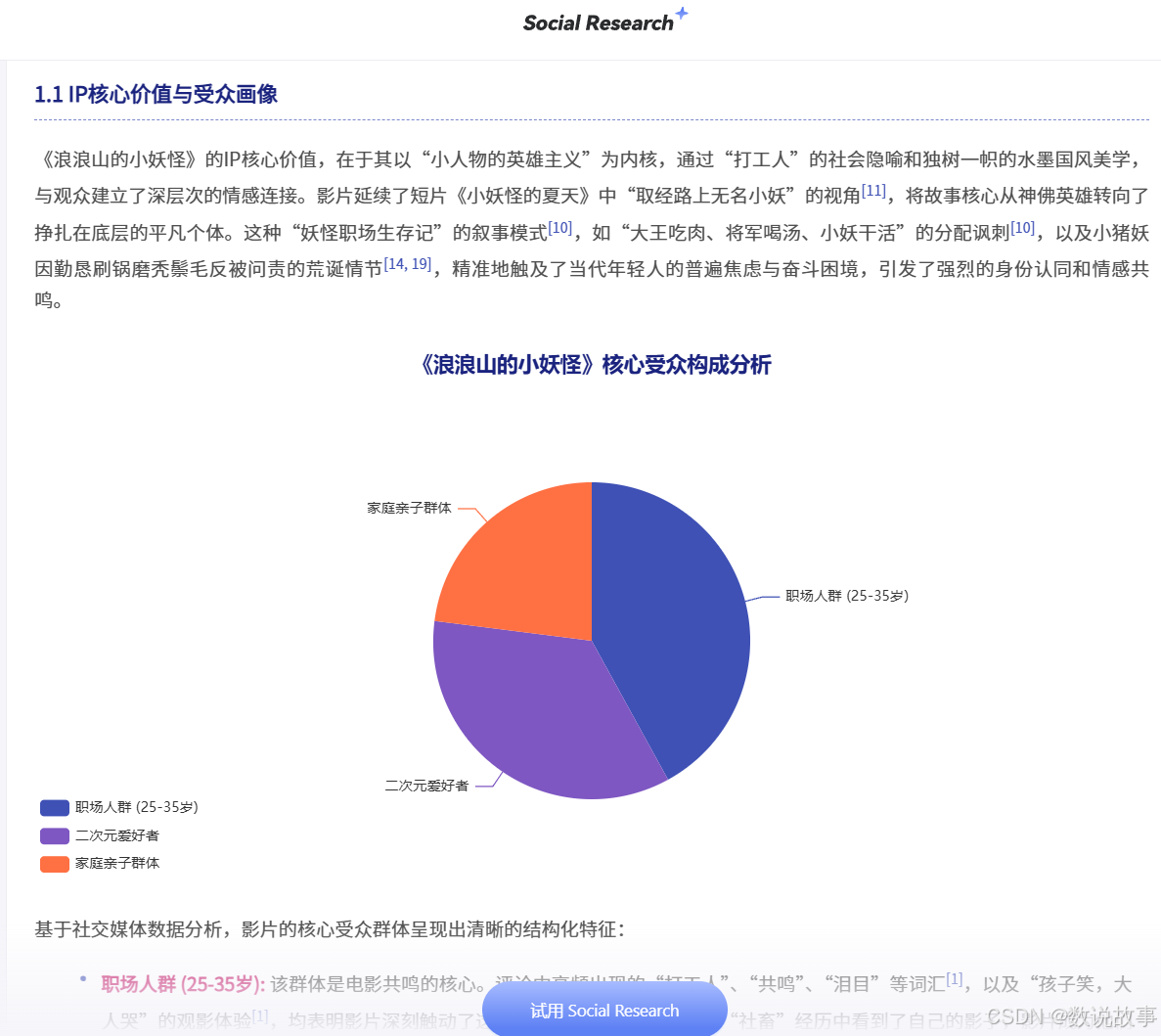 案例:分析《浪浪山小妖怪》联名营销时,工具30分钟内生成含“IP受众画像”“平台声量趋势”“用户情感倾向”的报告,细分出“职场梗引发共鸣”“跨界流量裂变” 等关键结论,比传统 3天流程提速80%。