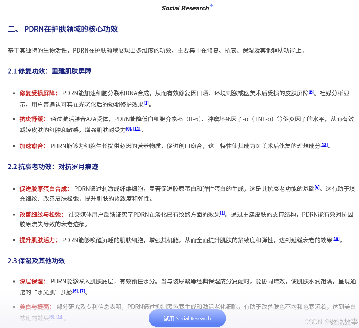 案例:某美妆品牌调研 “新成分 PDRN” 时,工具自动规划 “成分→功效→市场→用户” 框架,报告含执行摘要、数据来源标注,提炼出 “40% 认可修护功效,15% 反馈刺激” 结论及优化建议,结构对标咨询公司。