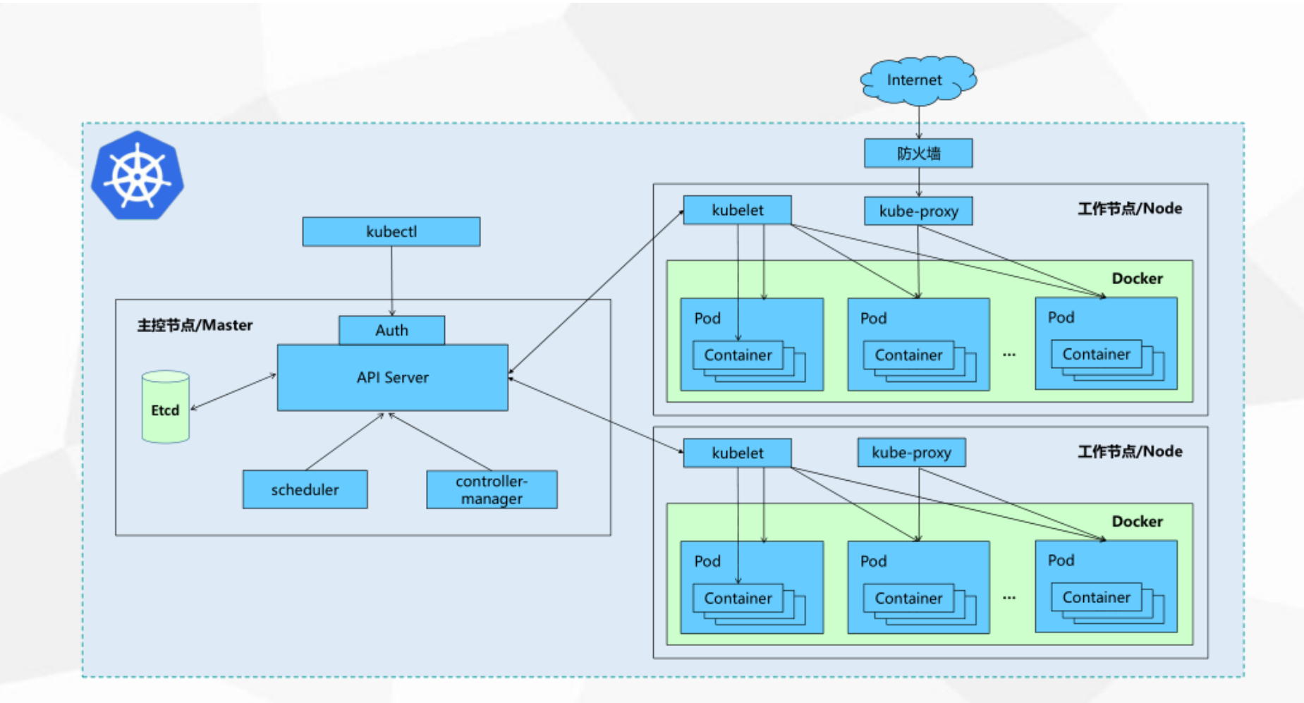 :保存集群状态,绿色圆柱形分布式数据库,存储集群所有状态信息(如Pod配置、节点健康状态),具备强一致性和高可用性