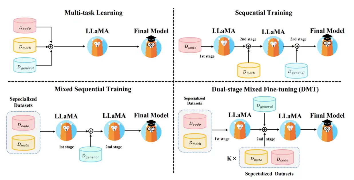 做法:第一阶段先在专业数据(如代码、数学)上做多任务学习;第二阶段转向通用能力数据再 SFT。