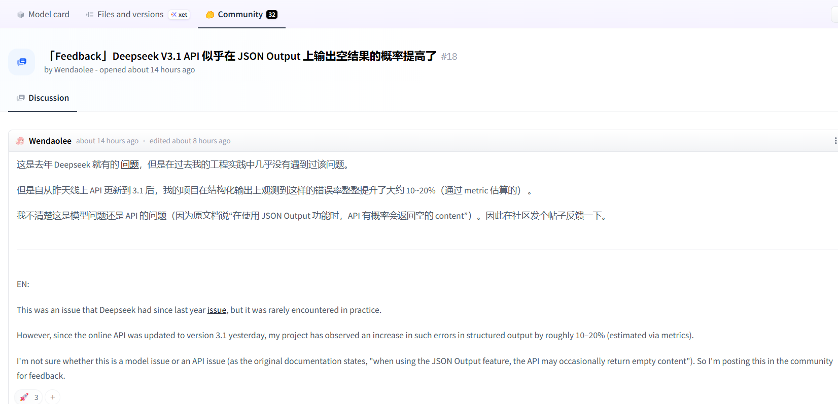 [3]deepseek-ai/DeepSeek-V3.1-Base · 「Feedback」Deepseek V3.1 API 似乎在 JSON Output 上输出空结果的概率提高了