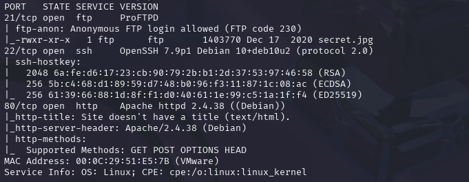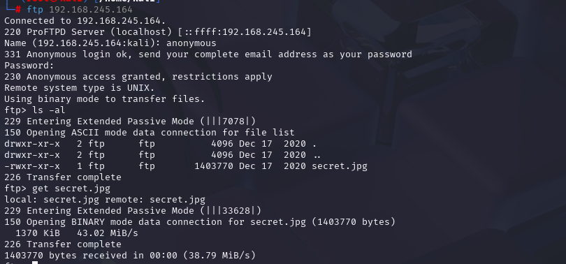 观察前面的21端口,有一个secret.jpg的文件,试一下ftp匿名登录(使用用户anonymous,输入密码时直接enter)并把文件下载下来