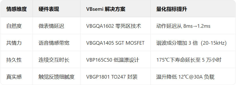 作为国内功率半导体领军企业,VBsemi(微碧半导体)的第三代器件方案,正在为情感机器人构建兼具 99.7% 能效与 0.1mm 级精度的 "硬件情感引擎",将冰冷的硅基材料转化为机器灵魂的律动载体。当 VBsemi 的 VBGQA1405 让机器人发出带着哽咽的安慰时,当 VBGQA1602 精确控制嘴角上扬的弧度时,功率半导体已不再是冷冰冰的物理元件 —— 它们正在成为机器 "情感 DNA"