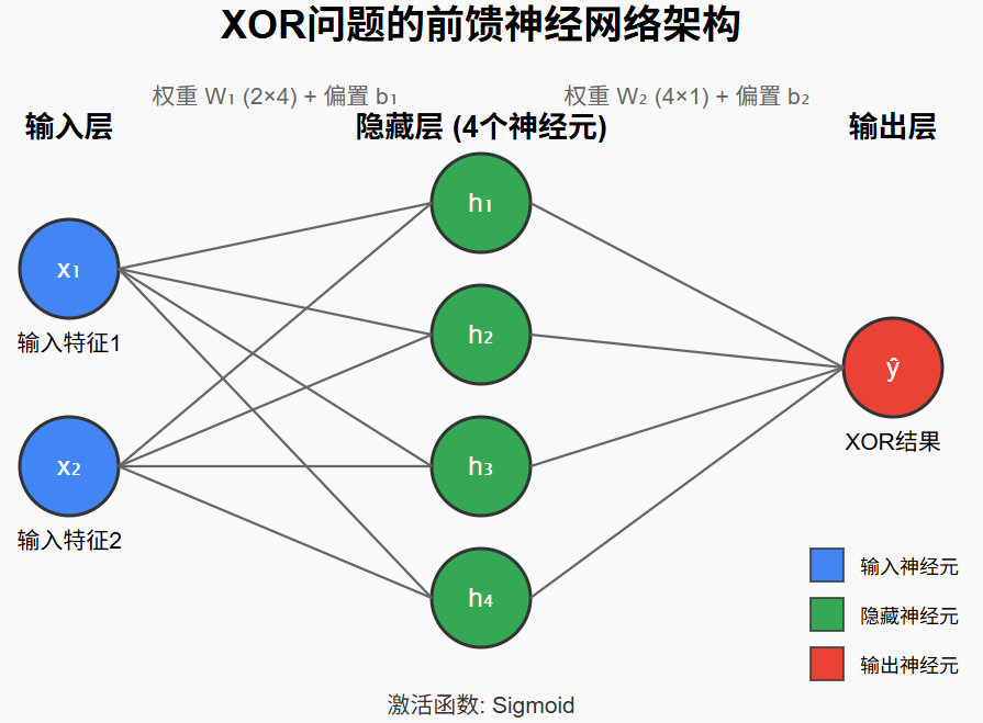 XOR问题是一个经典的小数据集,用来说明单层感知机无法解决非线性分类,必须通过至少一层隐藏层才能学会。