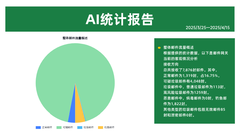 核心技术:支持每日定时生成 AI 统计报告,覆盖接收、外发、域内邮件三大维度,包含恶意发信人、恶意 IP、高频垃圾主题等数十个统计项,可自定义报告格式。