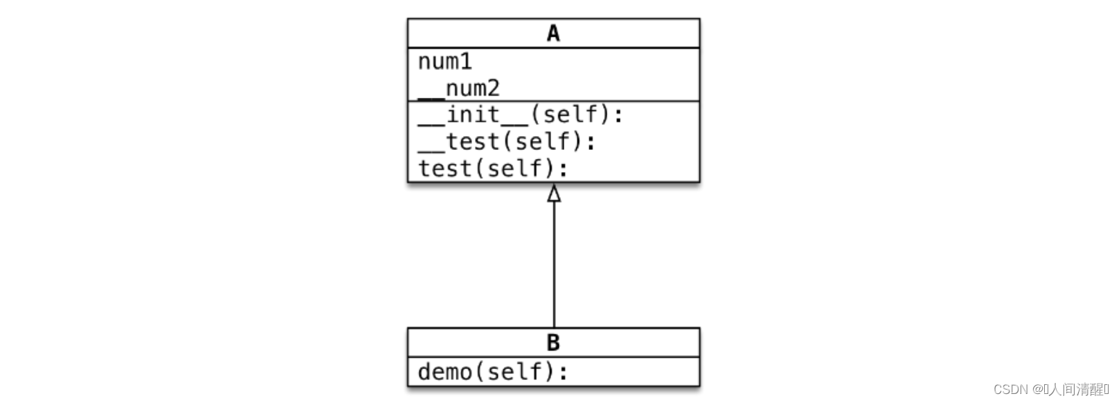 B的对象不能直接访问__num2属性B的对象不能在demo方法内访问__num2属性B的对象可以在demo方法内,调用父类的test方法- 父类的