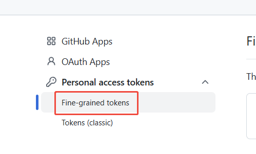 点击Persinal access tokens 点击Fine-grained personal access tokens