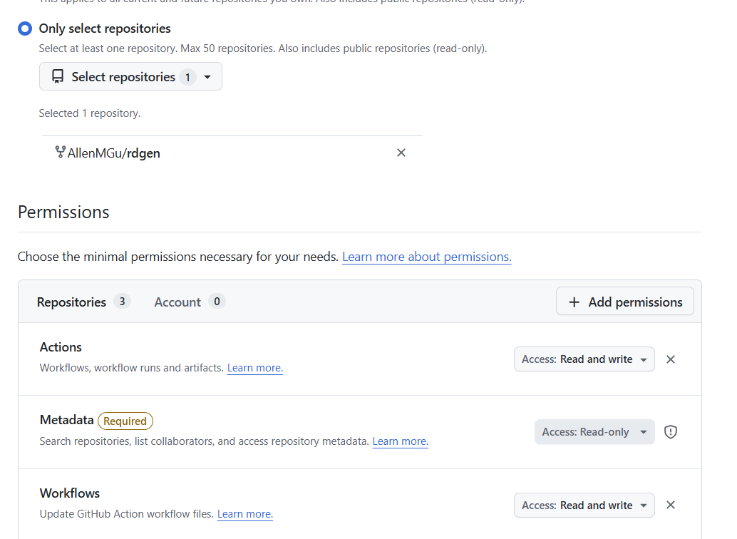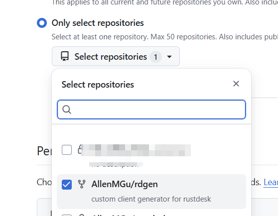 选择Only select repositories ,然后选择Fork 过来的 rdgen