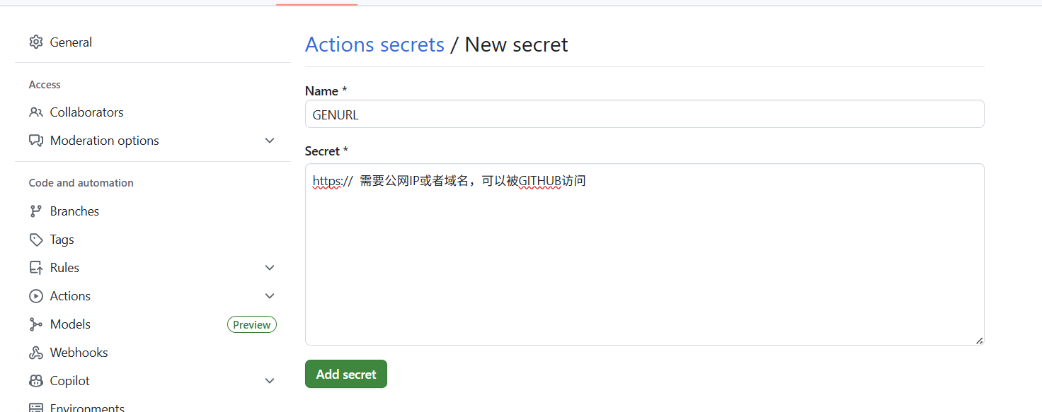 Secret * 格式https://0.0.0.0:8000 需要公网IP或者域名,可以被GITHUB访问