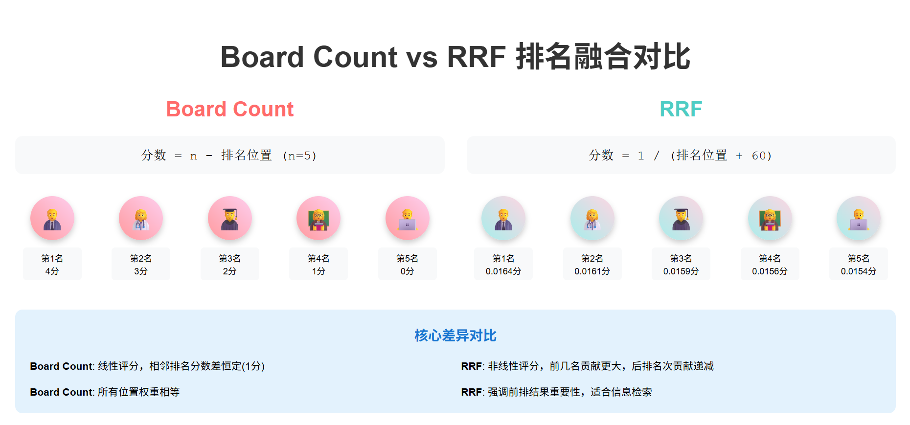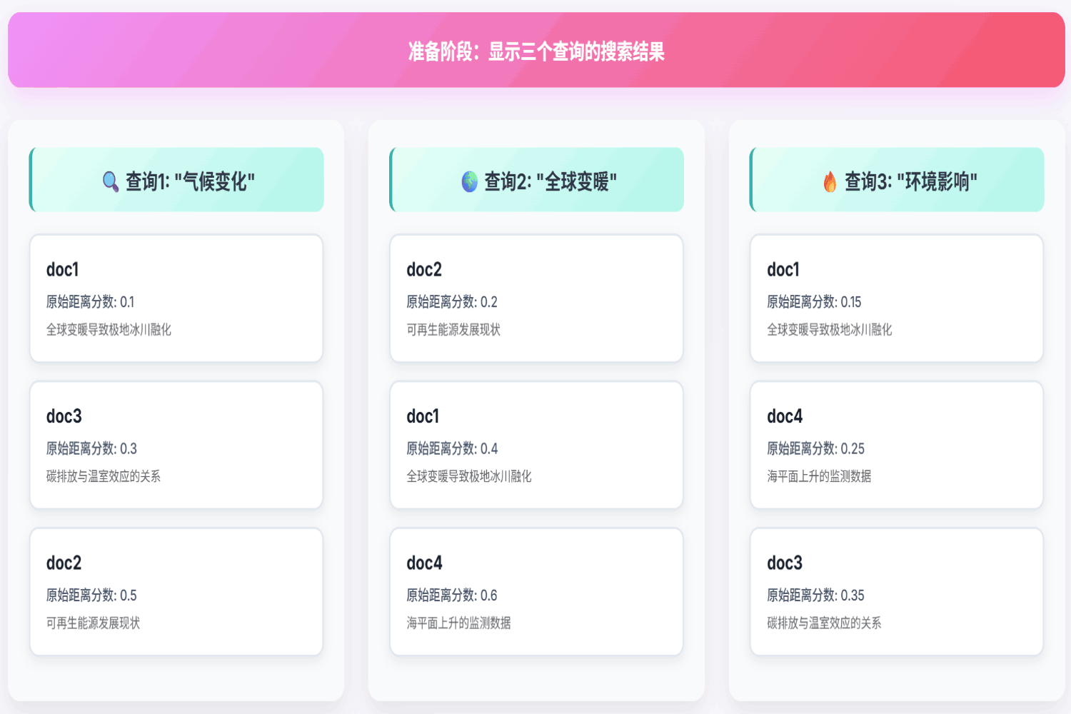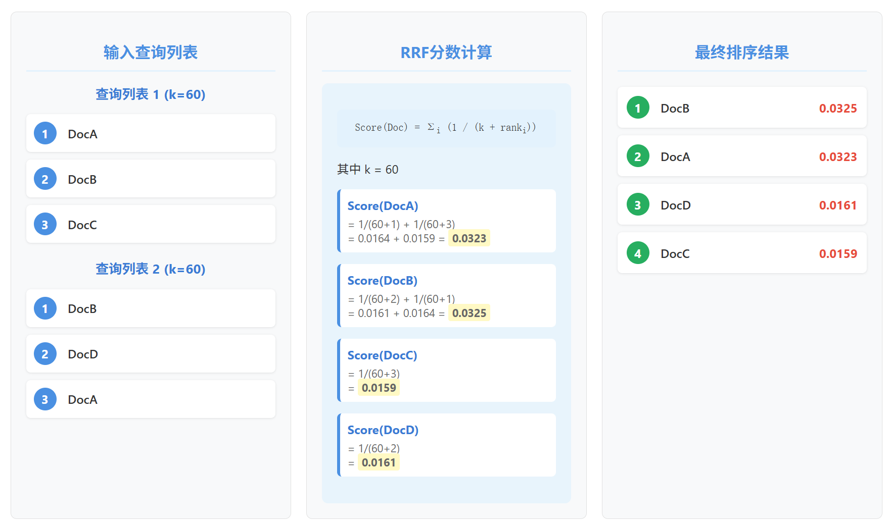 RRF的逻辑非常简单却极其有效:一个文档的重要性,不仅取决于它在某次查询中的排名,更取决于它是否能在多个不同的查询结果中都稳定出现。
