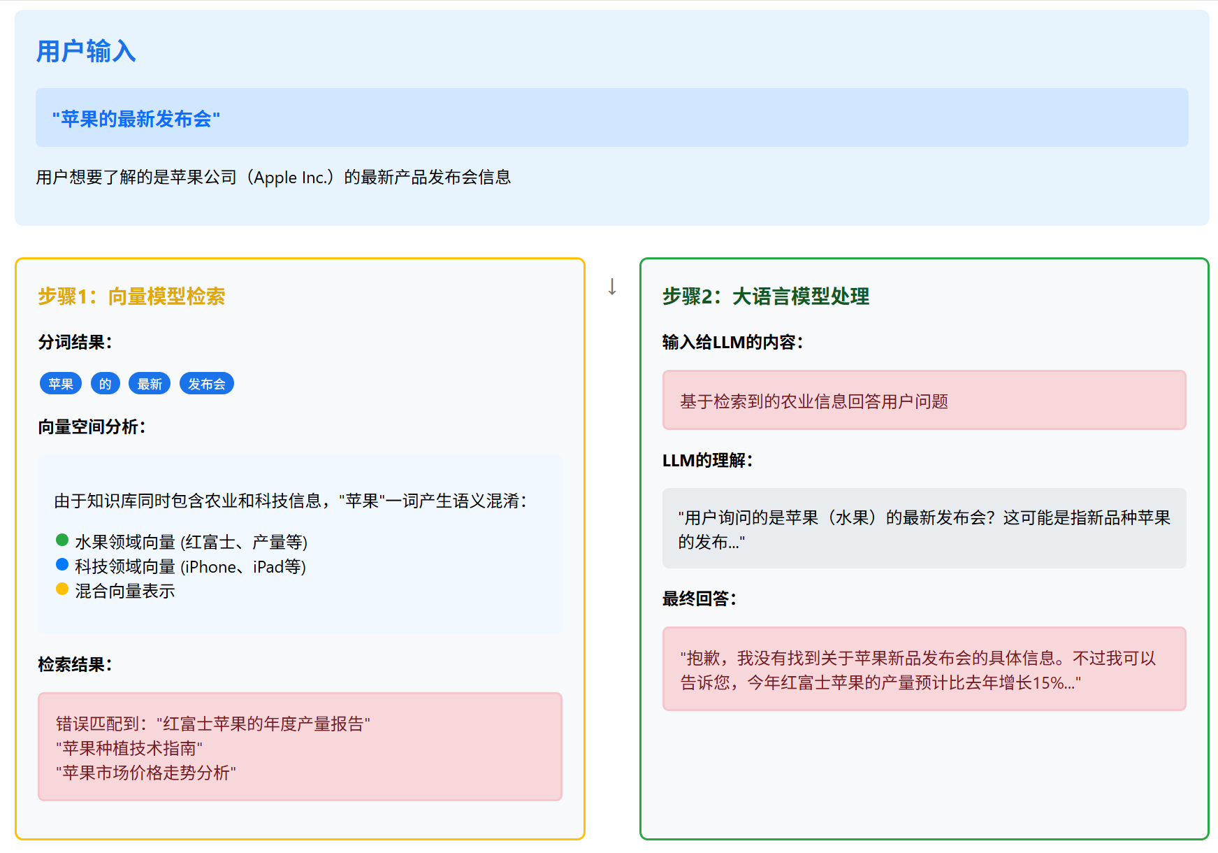 例子:用户输入"苹果的最新发布会"。如果你的知识库中同时包含有关"苹果"这一词的在农业和科技领域的信息,向量模型可能会因为“苹果”一词的向量产生混淆,最终检索出的结果是关于“xxx苹果的年度产量报告”。一旦这一步走错了,那后期LLM拿到的就是一堆水果信息,所产出的回答自然也就和用户的意愿相悖。