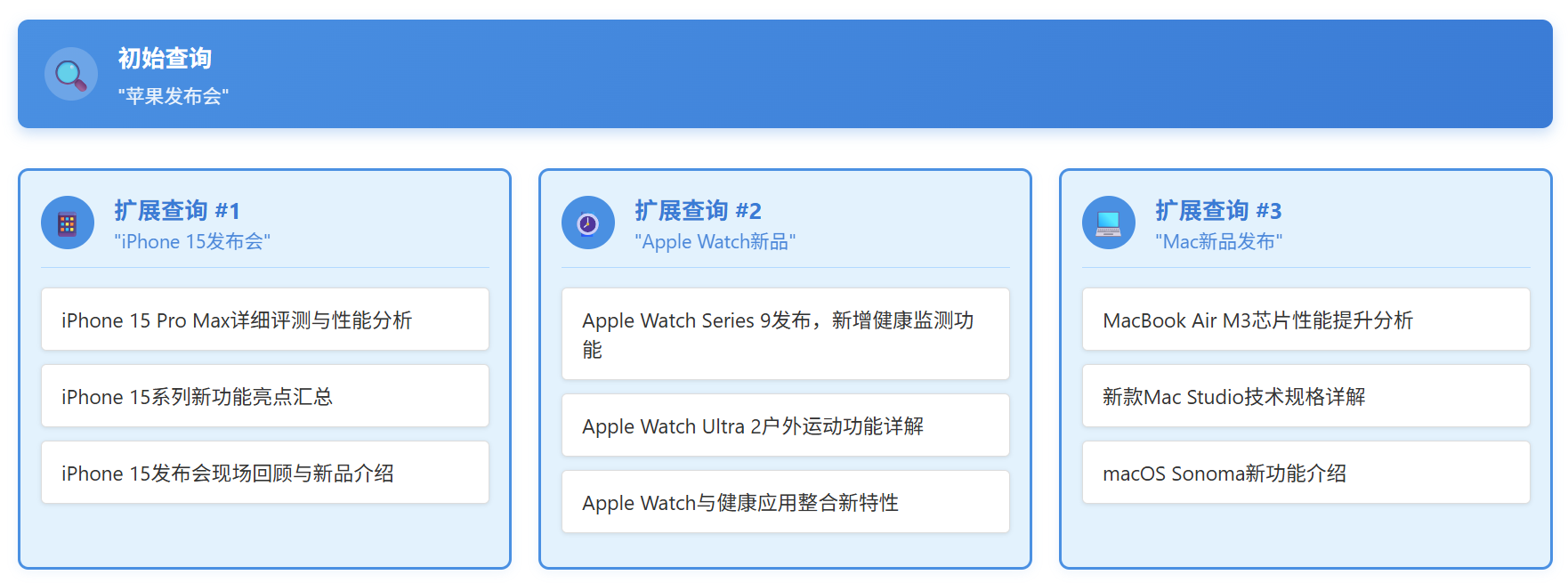 我们以1.1章节的例子来说明,RAG-Fusion会把用户的原始查询“苹果发布会”扩展成一组相互补充的查询,例如“Apple最新产品发布会”、“苹果公司最近有什么活动”、“iPhone系列发布会时间线“等一系列问题,覆盖同义表达(发布会/活动)、实体指代(Apple/苹果)、时间约束(最新/近期)与潜在子意图(产品线/新闻)。