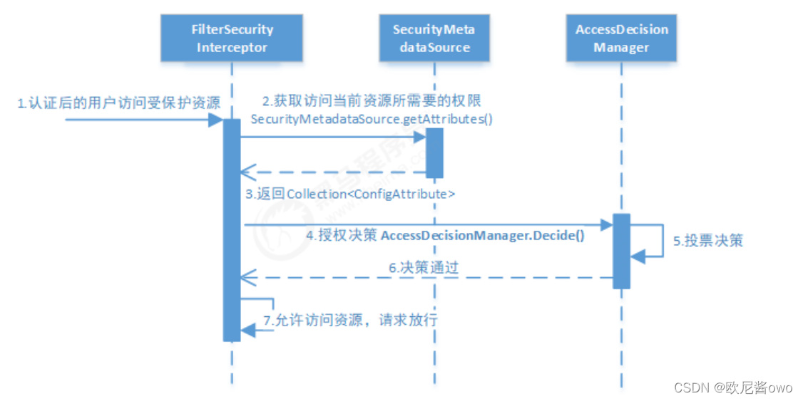 3. 最后,FilterSecurityInterceptor会调用 AccessDecisionManager 进行授权决策,若决策通过,则允许访问资源,否则将禁止访问。