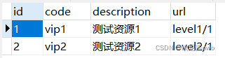 CREATE TABLE `t_permission` ( `id` varchar(32) NOT NULL, `code` varchar(32) NOT NULL COMMENT '权限标识符', `description` varchar(64) DEFAULT NULL COMMENT '描述', `url` varchar(128) DEFAULT NULL COMMENT '请求地址', PRIMARY KEY (`id`) ) ENGINE=InnoDB DEFAULT CHARSET=utf8 insert into `t_permission`(`id`,`code`,`description`,`url`) values ('1','p1','测试资源 1','/r/r1'),('2','p3','测试资源2','/r/r2');