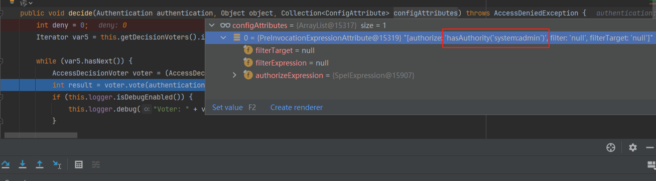 5.通过authentication里面的权限 credentials与configAttributes里面的权限做对比,判断是否能够访问这个权限