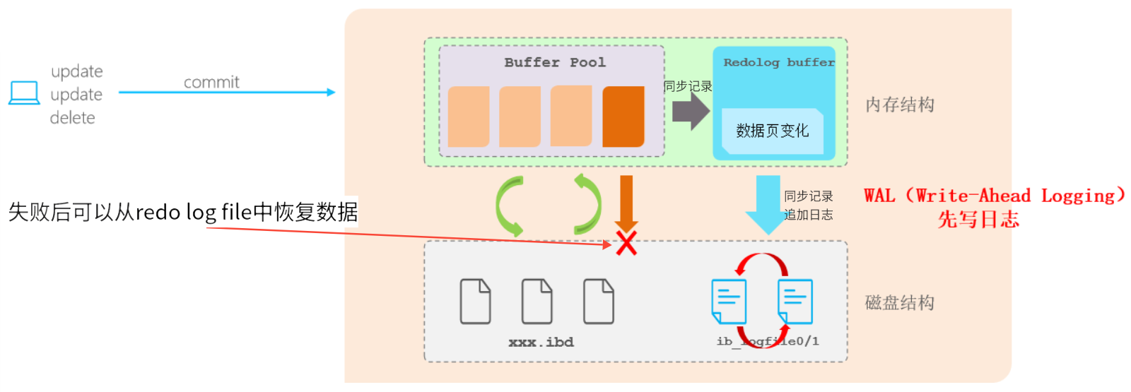 当事务提交之后会把所有修改信息都存到该日志文件中, 用于在刷新脏页到磁盘,发生错误时, 进行数据恢复使用。