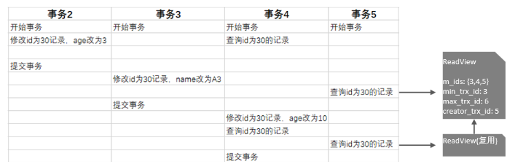 REPEATABLE READ(RR):仅在事务中第一次执行快照读时生成ReadView,后续复用该ReadView。