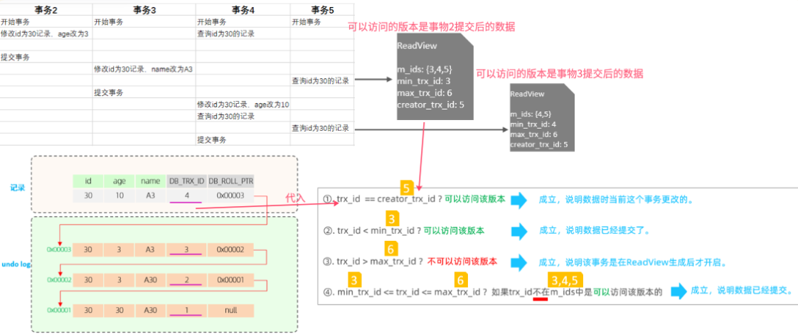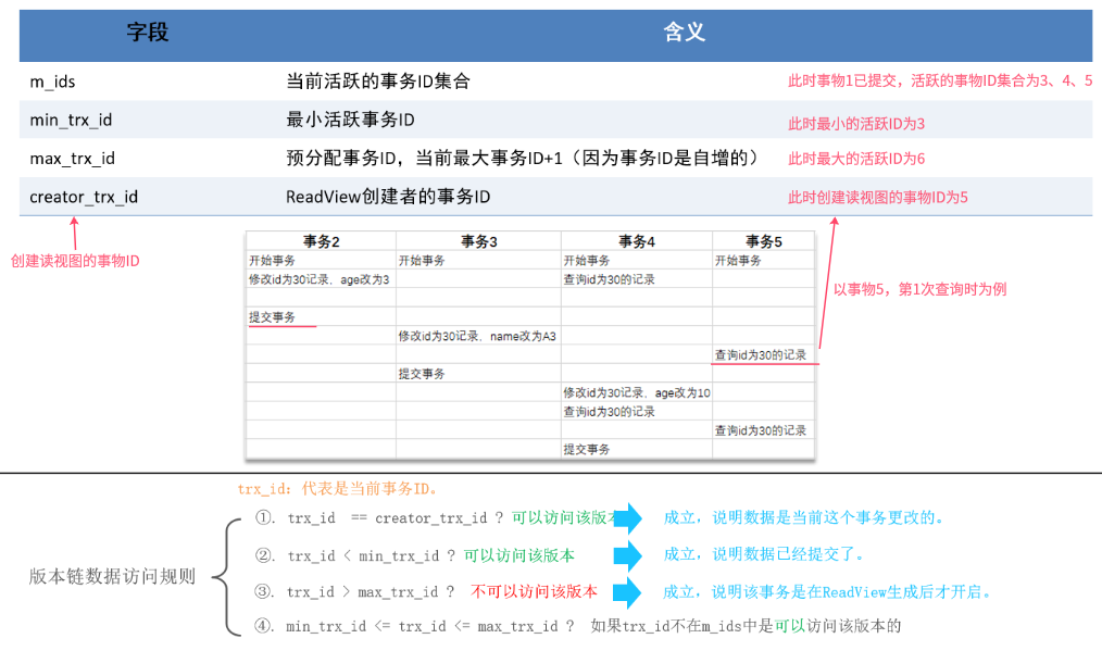 Readview中包含的四个核心字段及版本链数据访问规则: