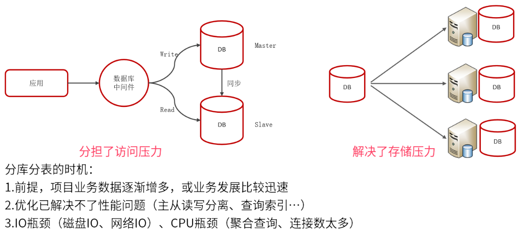 垂直分库(适用于微服务),根据业务进行拆分,高并发下提高磁盘IO和网络连接数