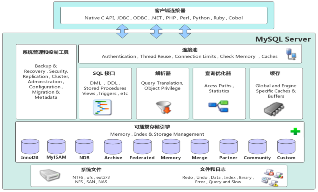MySql的体系结构:连接层、服务层、引擎层、存储层