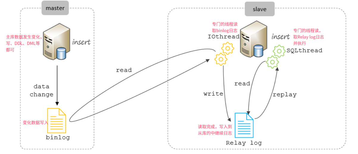 slave重做中继日志中的事件,将改变反映它自己的数据。