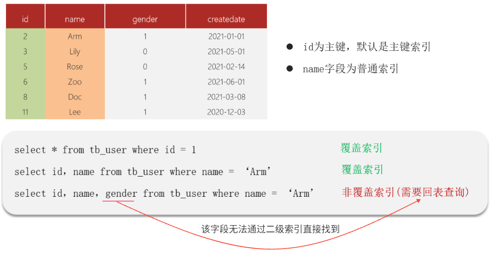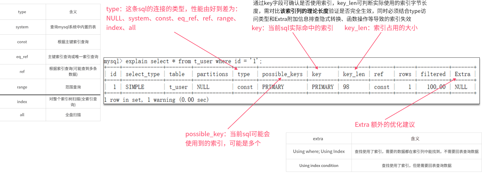 通过extra建议判断,是否出现了回表的情况,如果出现了,可以尝试添加索引或修改返回字段来修复。