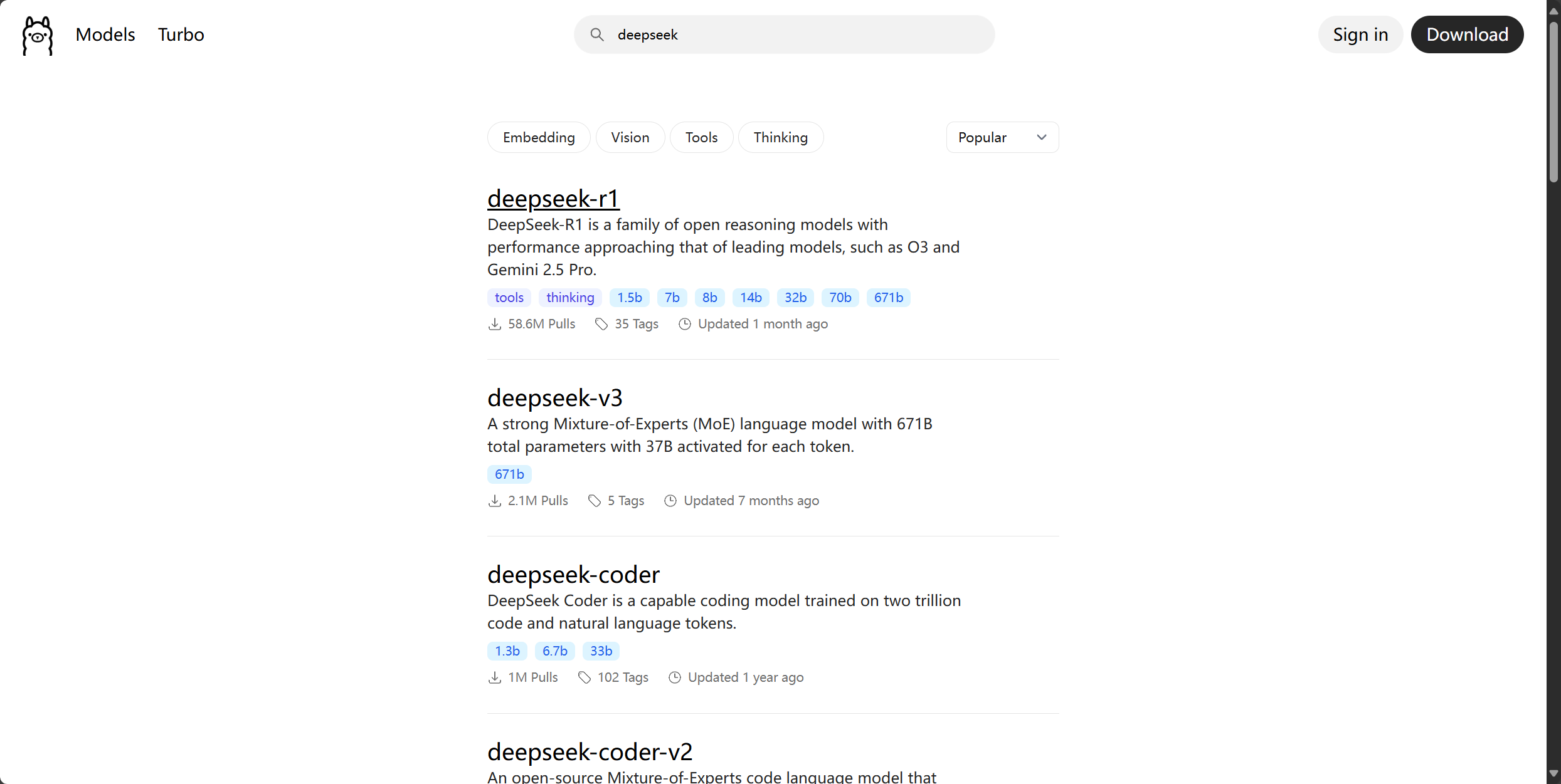 我们回到Ollama官网,搜索DeepSeek,选择自己想要部署的DeepSeek模型,我们这里选择deepSeek-r1。