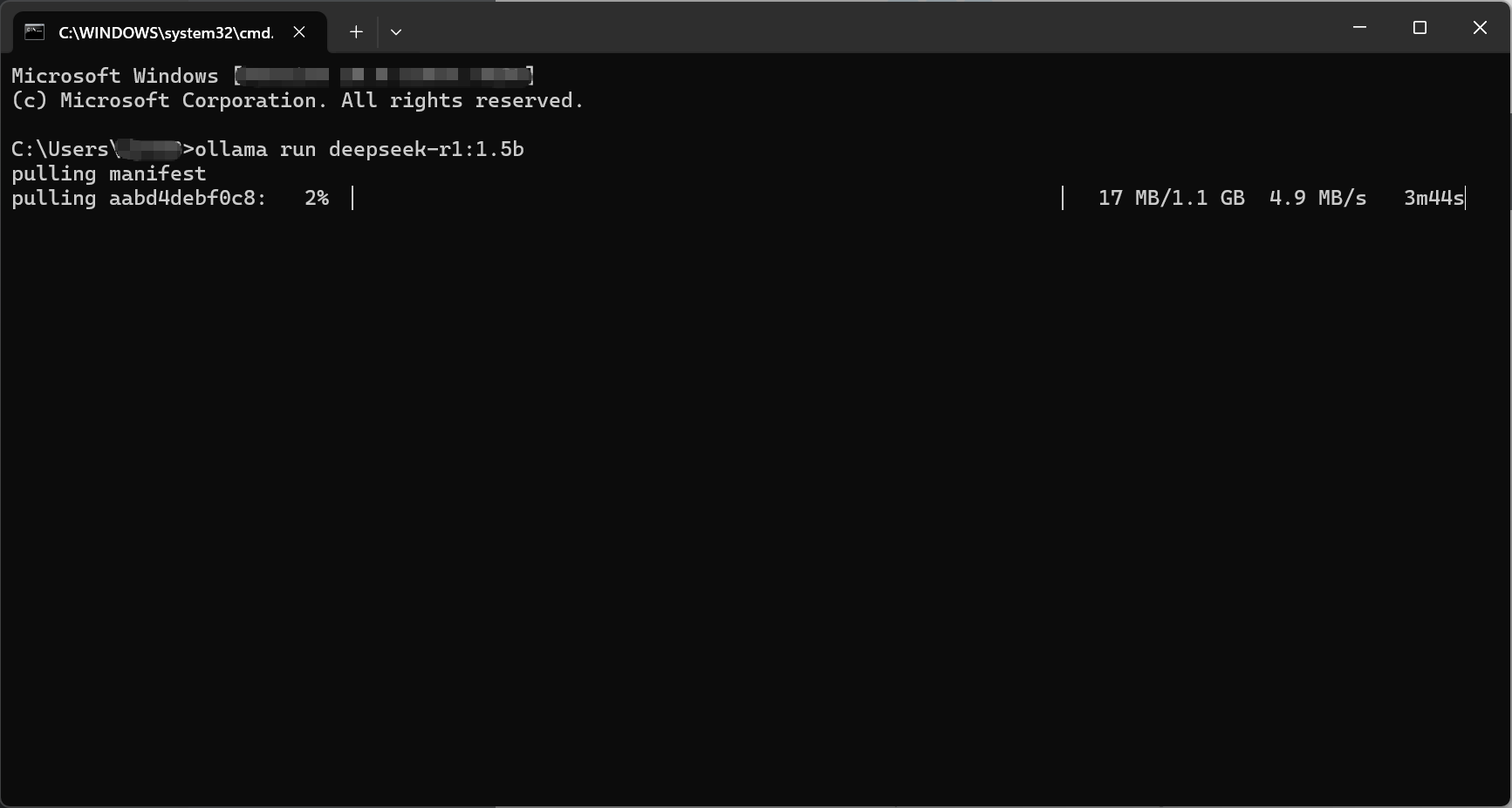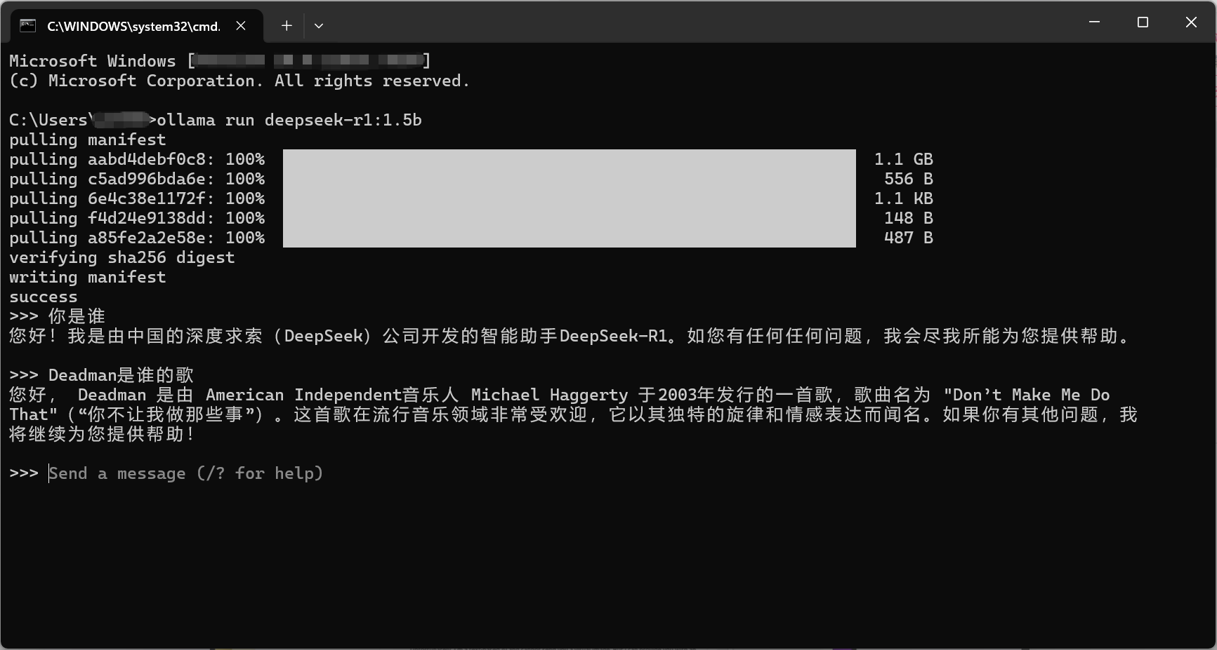 ollama run deepseek-r1:1.5b到命令行,执行运行,这个地方需要用一下魔法,否则下载比较慢。