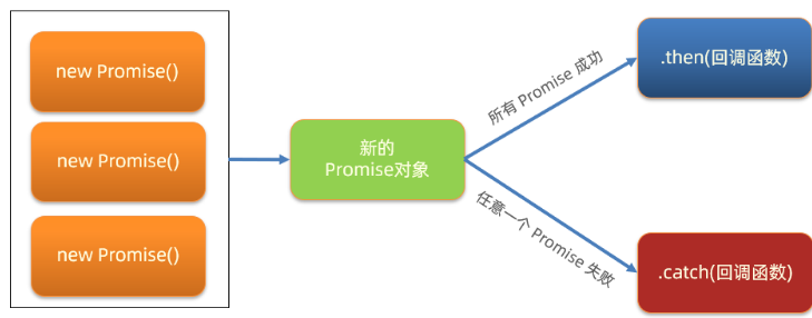 const p = Promise.all([Promise对象, Promise对象, ...]) p.then(result => { // result 结果: [Promise对象成功结果, Promise对象成功结果, ...] }).catch(error => { // 第一个失败的 Promise 对象,抛出的异常对象 }) -
