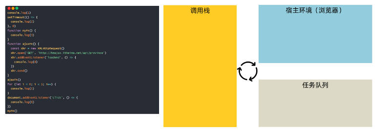 执行同步代码,遇到异步代码交给宿主浏览器环境执行 异步有了结果后,把回调函数放入任务队列排队 当调用栈空闲后,反复调用任务队列里的回调函数