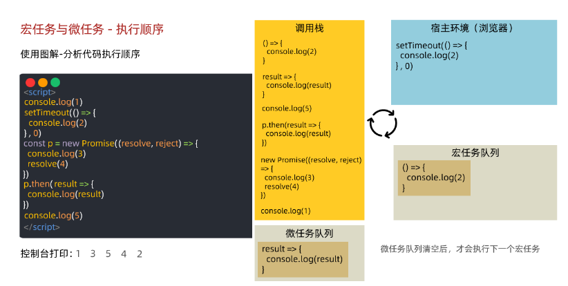 执行第一个 script 脚本事件宏任务,里面同步代码 遇到 宏任务/微任务 交给宿主环境,有结果回调函数进入对应队列 当执行栈空闲时,清空微任务队列,再执行下一个宏任务,从1再来