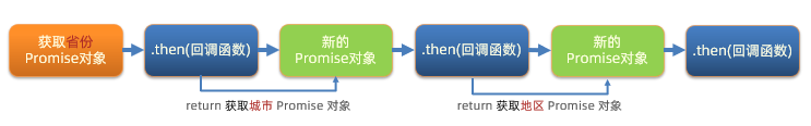 /** * 目标:掌握Promise的链式调用 * 需求:把省市的嵌套结构,改成链式调用的线性结构 */ // 1. 创建Promise对象-模拟请求省份名字 const p = new Promise((resolve, reject) => { setTimeout(() => { resolve('北京市') }, 2000) }) // 2. 获取省份名字 const p2 = p.then(result => { console.log(result) // 3. 创建Promise对象-模拟请求城市名字 // return Promise对象最终状态和结果,影响到新的Promise对象 return new Promise((resolve, reject) => { setTimeout(() => { resolve(result + '--- 北京') }, 2000) }) }) // 4. 获取城市名字 p2.then(result => { console.log(result) }) // then()原地的结果是一个新的Promise对象 console.log(p2 === p)