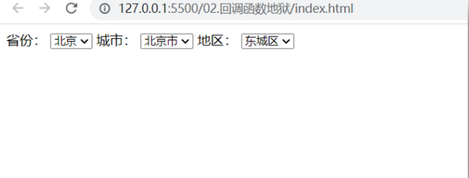 axios({ url: 'http://hmajax.itheima.net/api/province' }).then(result => { const pname = result.data.list[0] document.querySelector('.province').innerHTML = pname // 获取第一个省份默认下属的第一个城市名字 axios({ url: 'http://hmajax.itheima.net/api/city', params: { pname } }).then(result => { const cname = result.data.list[0] document.querySelector('.city').innerHTML = cname // 获取第一个城市默认下属第一个地区名字 axios({ url: 'http://hmajax.itheima.net/api/area', params: { pname, cname } }).then(result => { document.querySelector('.area').innerHTML = result.data.list[0] }) }) })