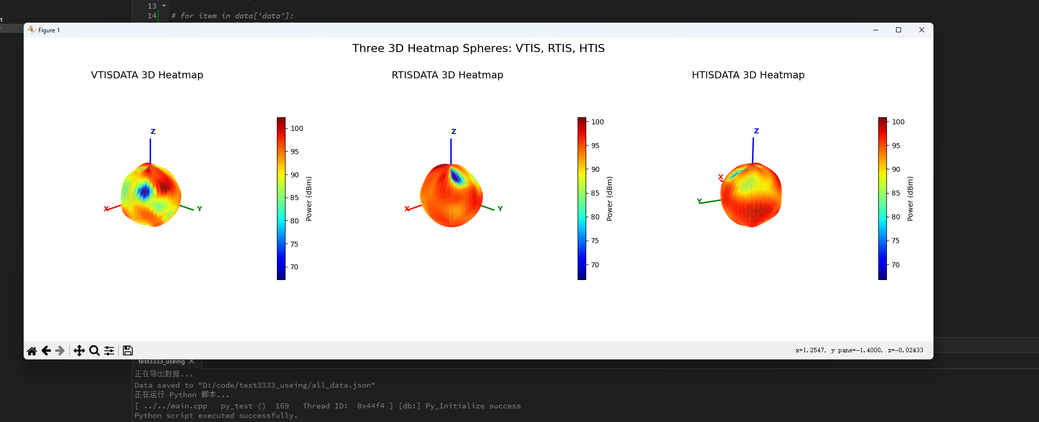 原本应该直接使用qt的C++语言直接画热力球的,但是我遇到着色器使用失败的问题,在网上找相关问题也比较少,就决定直接用python写。直接修改python文件的路径就可以执行你的python代码,在main函数里面调用py_test()函数即可。代码也很简单,将json文件提取出来,然后差值,转化笛卡尔坐标,绘图,使用power,生成球面,归一上色。主要的配置python环境,如果你是用qmake