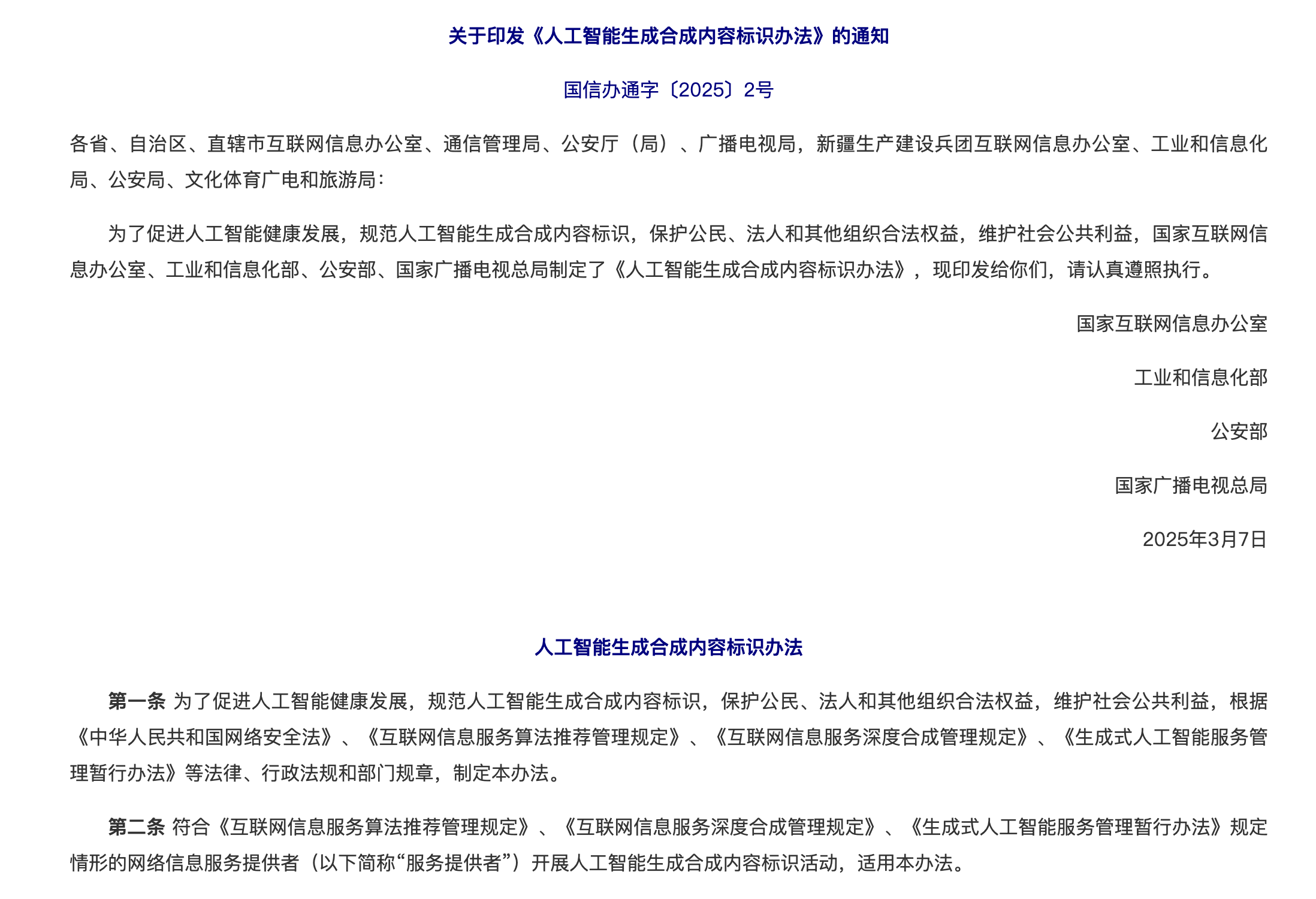但是从 2025年9月1日 起,这些“AI 出品”的内容都要被强制打上一个醒目的“身份证”标识。没错——《人工智能生成合成内容标识办法》就要正式实施了!