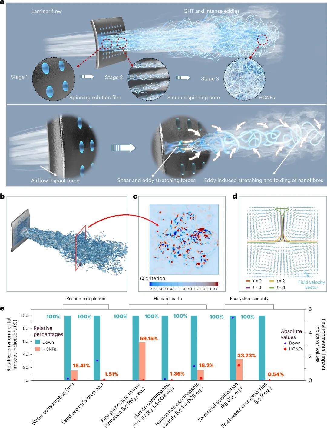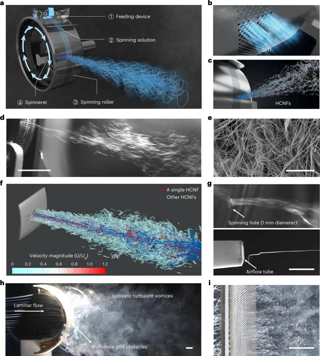 1.首创湍流纺丝技术突破量产瓶颈:多孔网格诱导高速气流产生均匀湍流涡旋,通过涡对拉伸-折叠纳米纤维,实现曲率超120°(最高450°)、孔隙率达99.60%的HCNFs连续化生产,单孔效率达11.4 g/h,较传统纺丝提升10倍。